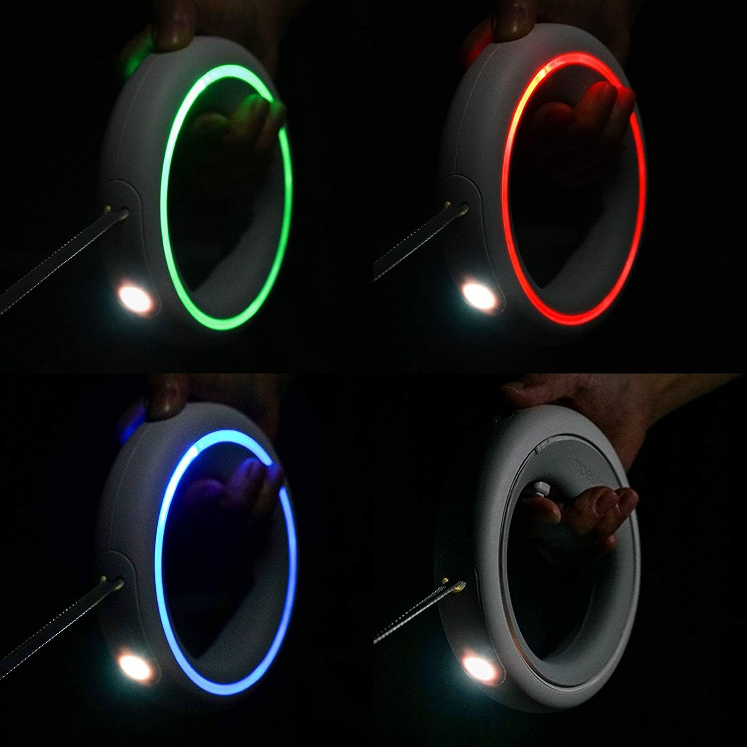 Papildomai pavadėlis turi 3 spalvų rankenos žiedinius LED žibintus, kurie: